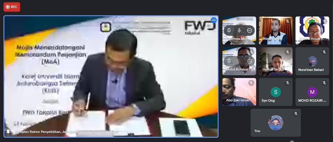 24 November 2021 - Majlis Menandatangani Memorandum Perjanjian (MoA) antara KUIS dan FWD Takaful Berhad telah berlangsung dengan jayanya pada hari ini. MoA yang ditandatangani itu merupakan perjanjian kerjasama penyelidikan bagi geran industri yang julung kalinya diterima oleh KUIS.
